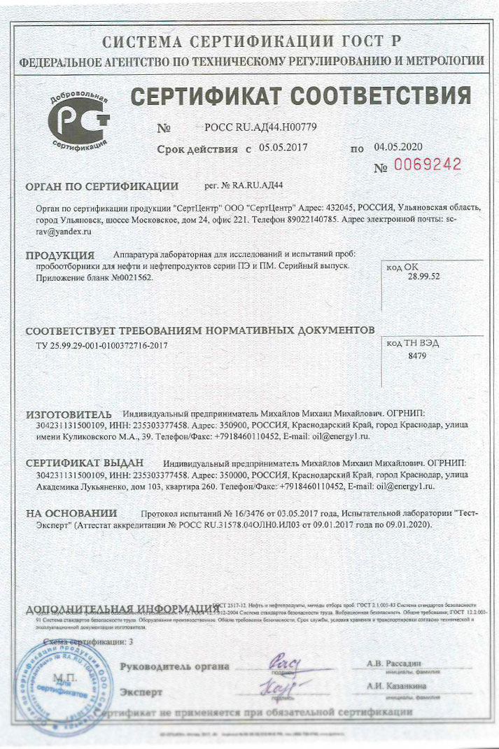 PE-1651 sampler is used by oil refineries, gas stations, tank farms.